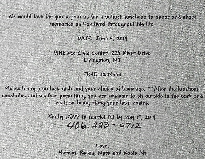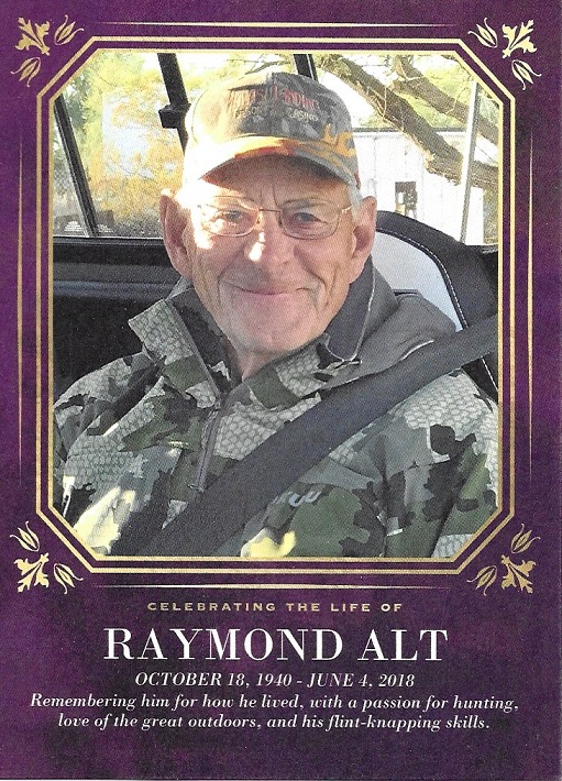 Raymond S. Alt, 77, of Livingston, Montana passed away on Monday, June 4, 2018 at his home with his family at his side. Ray was a Great Family man, Great Friend to all, Flintknapper, Hunter Extraordinaire, and all around Great Guy! His contribution to our flintknapping community was extensive and always appreciated. A frequent paricipant, Ray also organized and hosted the Elk River Knap-in at the Yellowstone Gate Way Museum for several years. His gracious demeanor and helpful advice were alway a positive influence on all of our members young and old! Comments from Friends: "Sad to hear Ray Alt has passed onto the next life. He was very friendly and always treated me with respect. I’ll miss seeing his face when I visit Montana." Douglas Cowan "He was such a positive force and inspiration!" Jim and Beverly Keffer "Ray was a loving husband, father and friend. He was an excellent flintknapper and hunter and co-hosted the Elk River Knapin in Livngston, MT. Our group spent many winters together in AZ. We will miss him and keep his family in our prayers!" Joan Lubin Urata "So glad they got to have a good winter in AZ this year and glad we got to spend a little time with them. Prayers and love to Harriet and the family." Marilyn Hemphill "Such a good guy. We were so saddened to hear this news. Our thoughts and prayers are with you Harriet and family." Rose Murdock