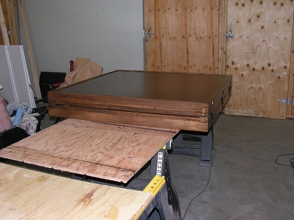 2.  Lids - (2) 48" x 48" x 1" red oak.  Corners are mitered, glued, pinned is bamboo dowels and reinforces with 1/2" brass angle braces